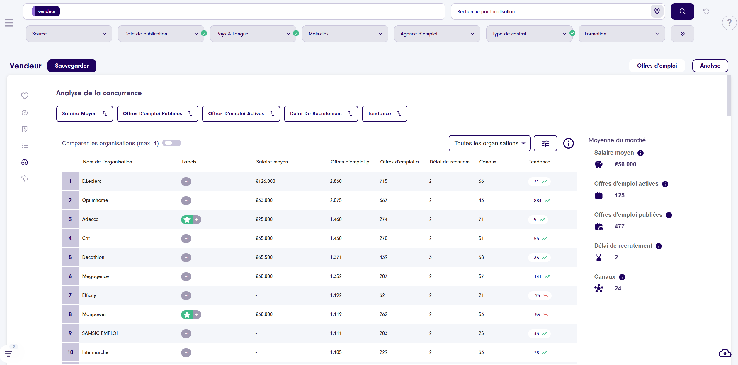 Par exemple, vous aurez un aperçu direct de l’endroit où se trouve la plus forte demande ou qui émet le plus d’offres d’emploi pour un certain type de poste. Utilisez ces informations pertinentes sur le marché du travail pour définir votre stratégie, améliorer vos méthodes de travail, perfectionner votre argumentaire de vente, cibler vos attentes lors de la rédaction d’une annonce, vous aider lors d’un entretien avec la société qui cherche à recruter et favorise un meilleur matching entre l’offre et le candidat.