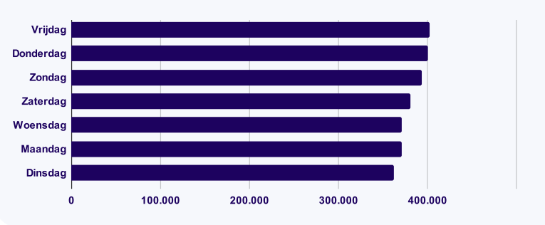 In 2025 vonden we in heel België ruim 2,6 miljoen vacatures. De meeste vacatures verschenen op dinsdag 13 mei, maar over het algemeen was dit niet de dag waarop de meeste vacatures online stonden. Dat was namelijk vrijdag, gevolgd door donderdag.