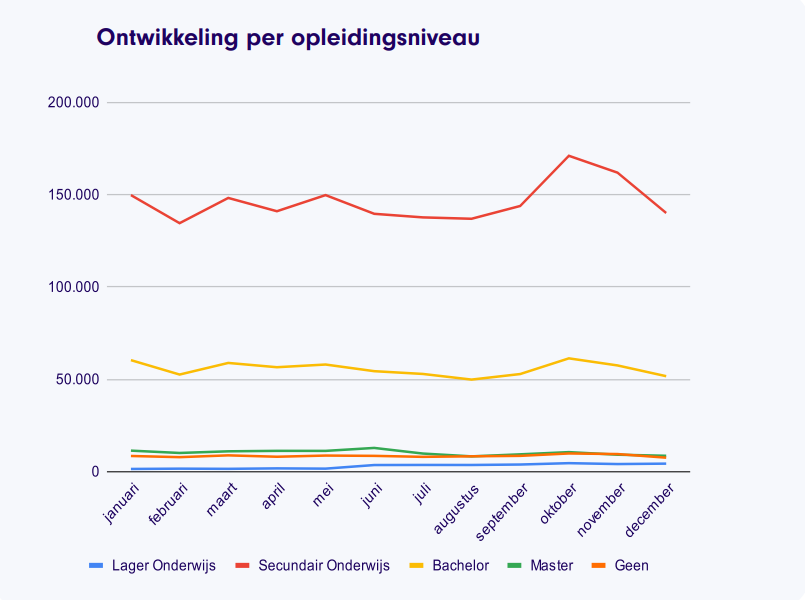 We zien dat het hele jaar door dat het secundaire onderwijs het meest gevraagd wordt in vacatures, gevolgd door bachelor. Dit betekent dat veel werkgevers en bemiddelaars op zoek zijn naar mensen met dit diploma, wat het lastig kan maken om voldoende personeel te vinden, omdat er veel concurrentie is.
