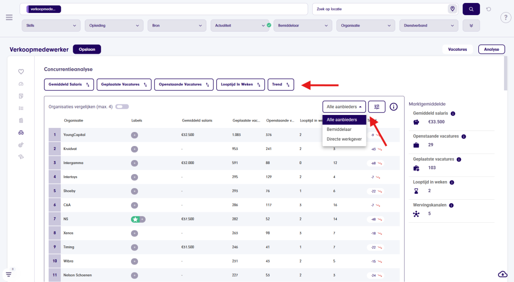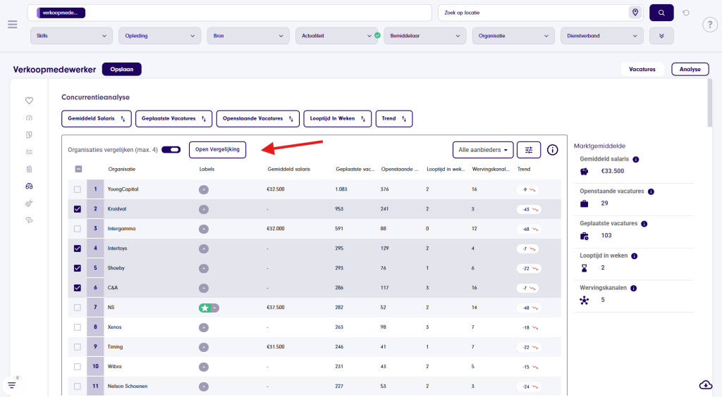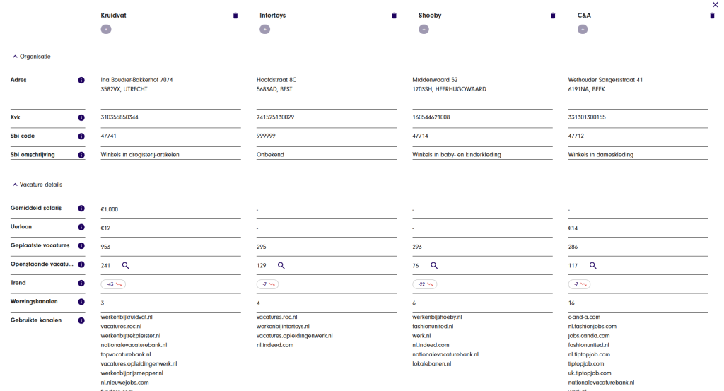 Je ontdekt dan in één oogopslag de top 100 aanbieders met de meest geplaatste vacatures van de afgelopen maanden. Deze aanbieders kun je met elkaar vergelijken, met een maximum van vier directe werkgevers en/of bemiddelaars tegelijk. Zo ontstaat een duidelijk overzicht van de organisaties, waarin ze naast elkaar worden gezet op basis van verschillende factoren zoals organisaties, vacature details, contractvormen, functietitels, skills en beroepsklasse.