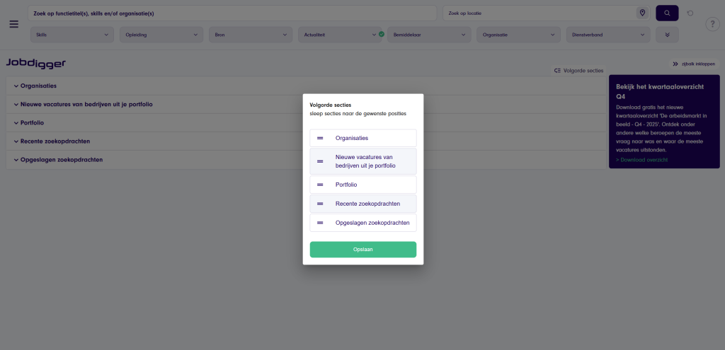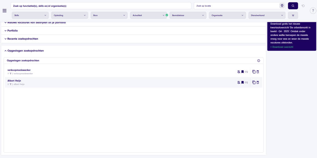 Recente zoekopdrachten: Op de homepage vind je je meest recente zoekopdrachten overzichtelijk onder elkaar. Vanuit daar kun je ze eenvoudig opslaan als nieuwe zoekopdracht. Ook bestaat de mogelijkheid om de recente zoekopdrachten van je collega’s te bekijken.Opgeslagen zoekopdrachten: Heb je zoekopdrachten opgeslagen? Dan vind je ze terug op je homepagina. Je kunt meldingen in- of uitschakelen, de zoekopdracht bewerken of een kopie maken.