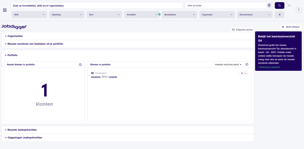 Vacatures: In dit gedeelte zie je de gevonden vacatures die binnen je ingestelde portfolio labels passen. Via de filterknop kun je filteren op verschillende labels, zoals klant of prospect. Ook kun je ervoor kiezen om de meest relevante vacatures te zien door een focusprofiel te activeren. Portfolio: Heb je klanten in je portfolio staan? Dan zie je deze vanaf nu ook terug op de homepage. Je ziet direct alle openstaande vacatures bij deze klant en je hebt de mogelijkheid om een bedrijfsanalyse uit te voeren